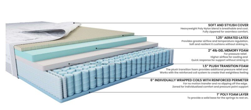 Materials: memory foam, high-density support foam, and individually pocketed coils
